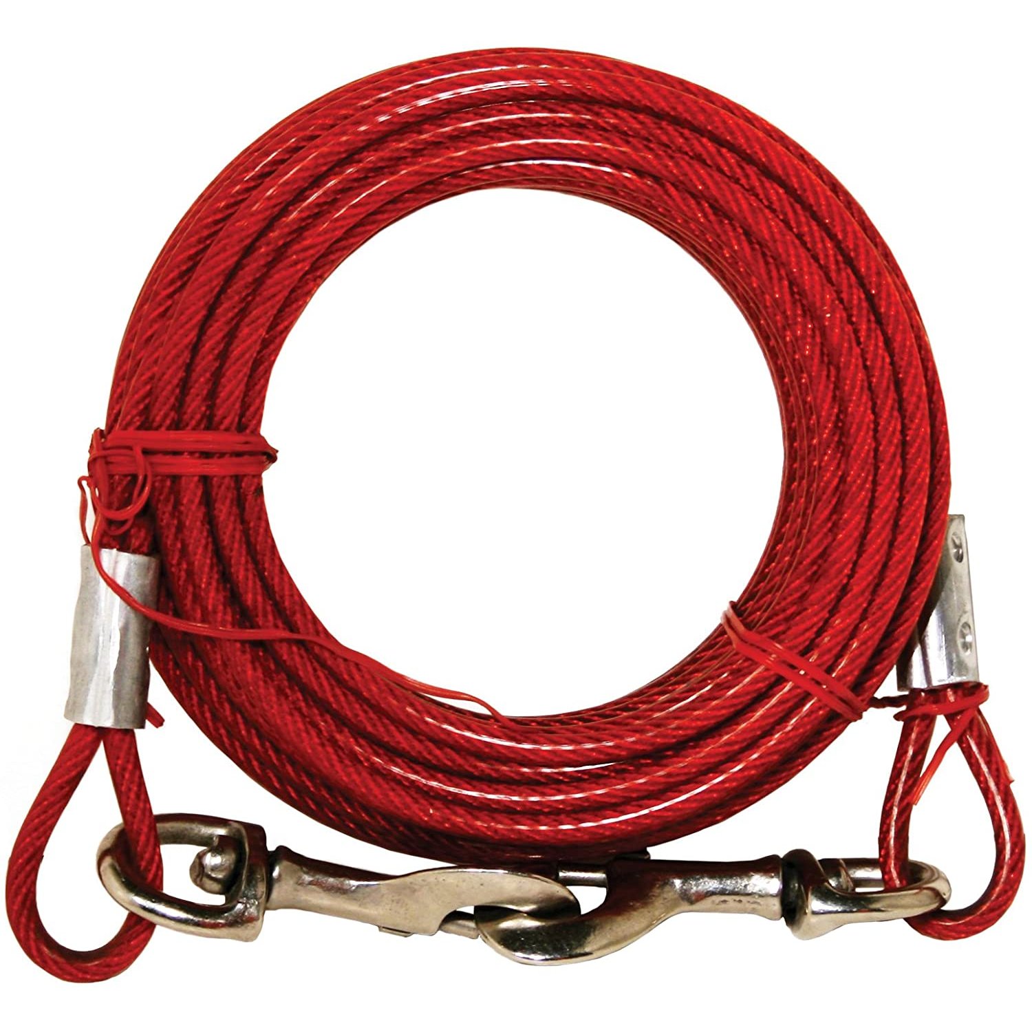Prevue Pet Products medium-duty 10Æ tie-out cable 2118 is designed for dogs up to 65 lbs. Medium duty, galvanized aircraft-grade wound-steel cable is housed within crack-resistant, high visibility Red vinyl casing to ensure your dog stays safe and secure. Premium quality die-cast iron swivel bolt snaps at both ends to connect easily. Medium duty tie out cable is 10 foot long with a 3.3 mm diameter wire cable; 4.8 mm in vinyl casing.