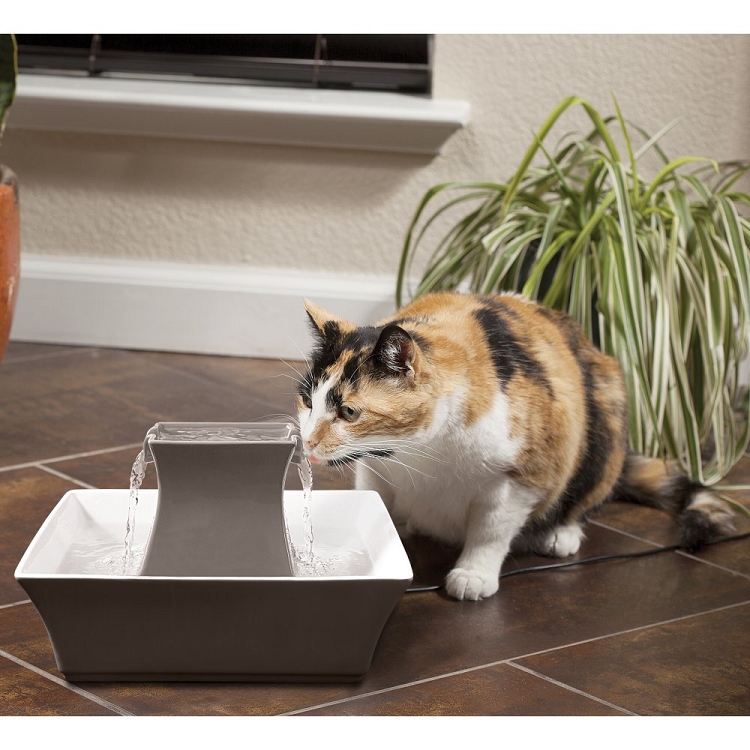 The new Taupe Stoneware Pagoda pet fountain combines fashion and function. This fountain continuously recirculates 70 ounces of fresh, filtered water. Best of all, the stylish ceramic design is easy to clean and looks great in your home.