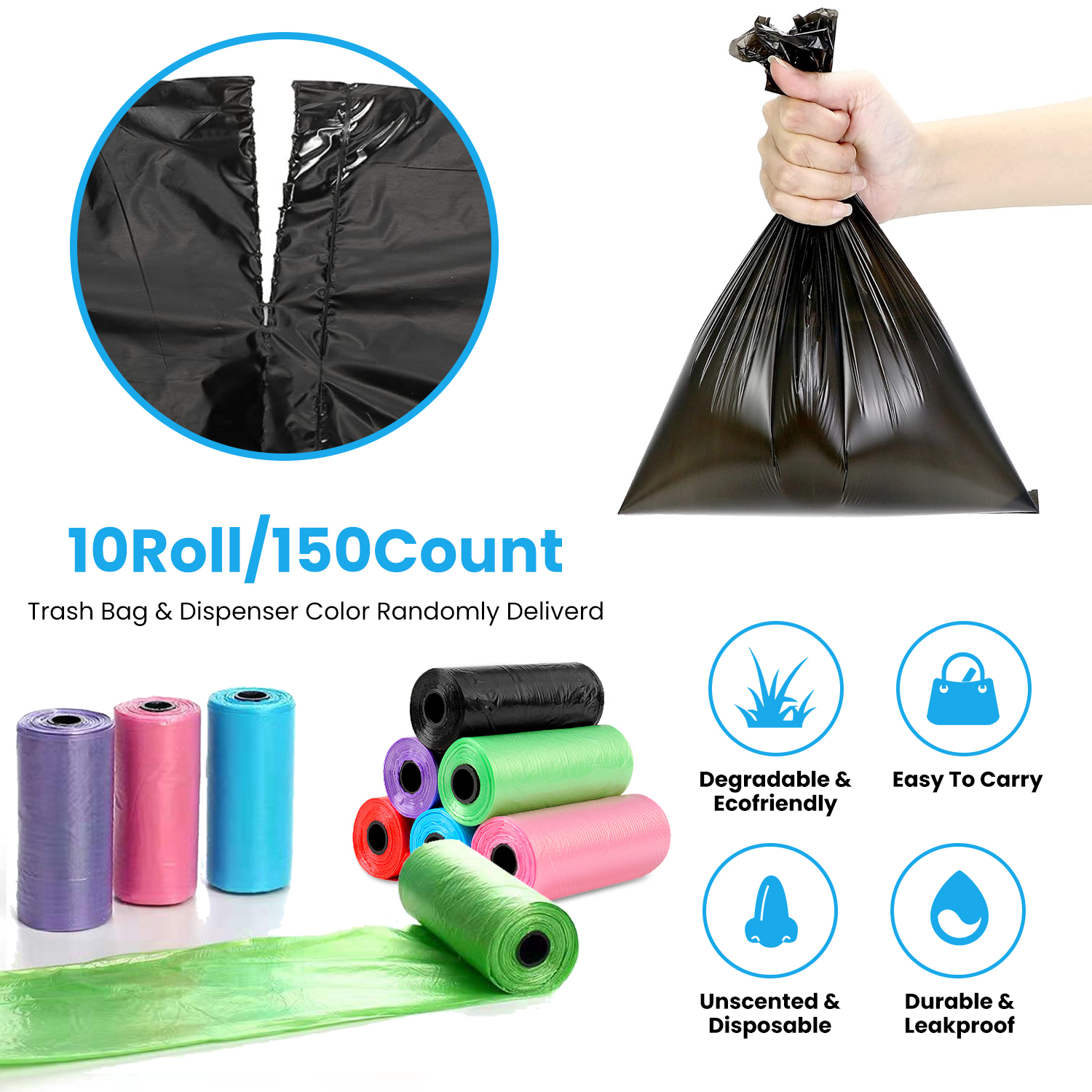 • 10 Rolls & 150 Counts: The waste bags will come in 10 rolls, 150 count in total. Easily accessible and enough amount to last for about 3 months.