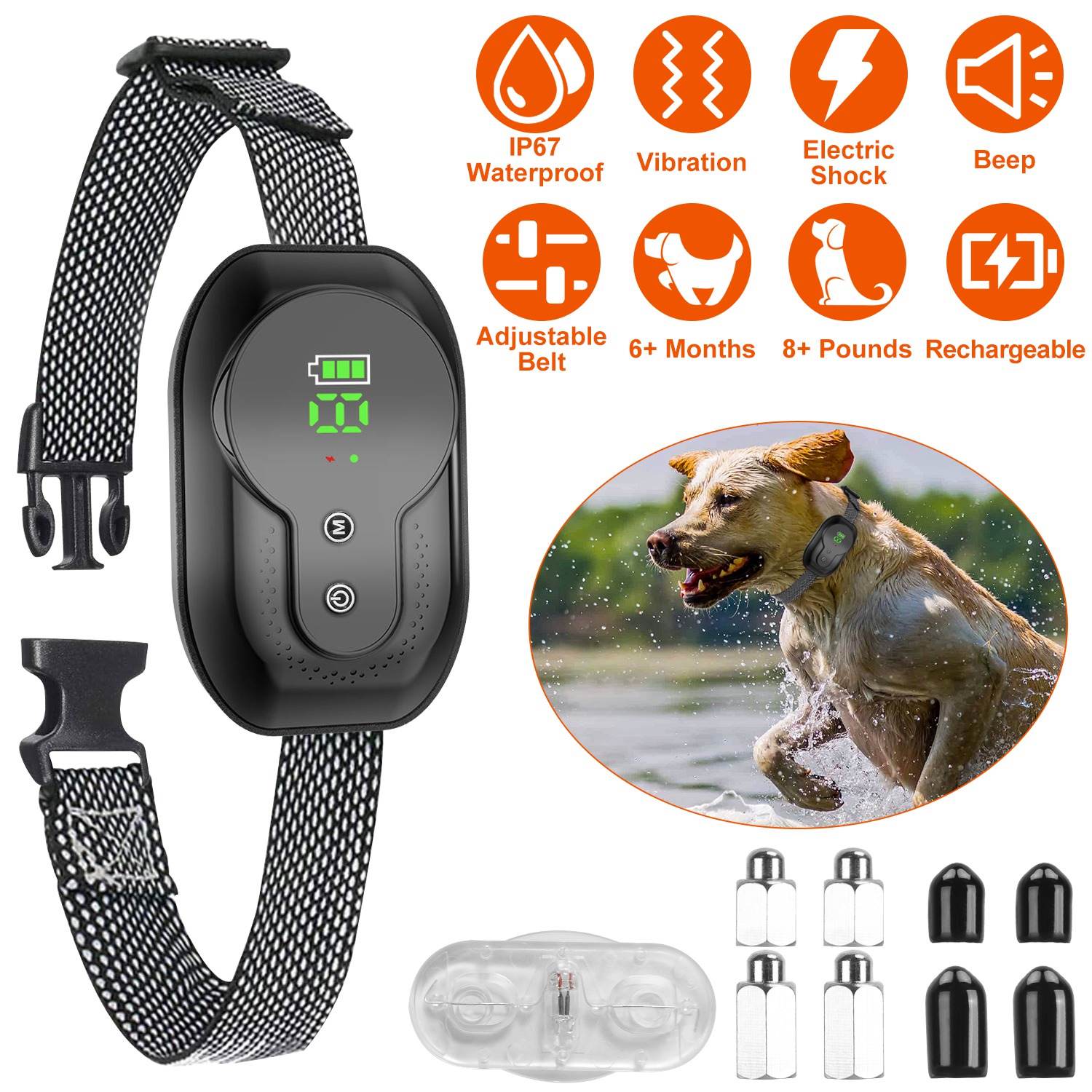 • USB Rechargeable & IP67 Waterproof: Charged only about 2 hours, the collar can work about 10-15 days according to the frequency of dog barking. IP67 Waterproof performance ensures the dog can play by the swimming pool/beach or in rainy day, etc..