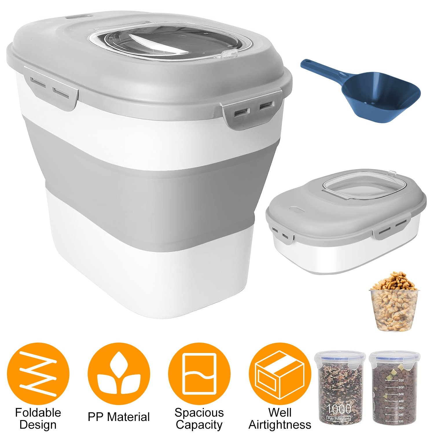 • Ample Accessories: Package includes measuring cup with clear scale and food scoop, you can use them to properly measure the proportion of rice or pet food to make a healthy standard diet. Also come with 2Pcs 34oz airtight containers, provides you with extra kitchen pantry tools for all-in-one storage solution.