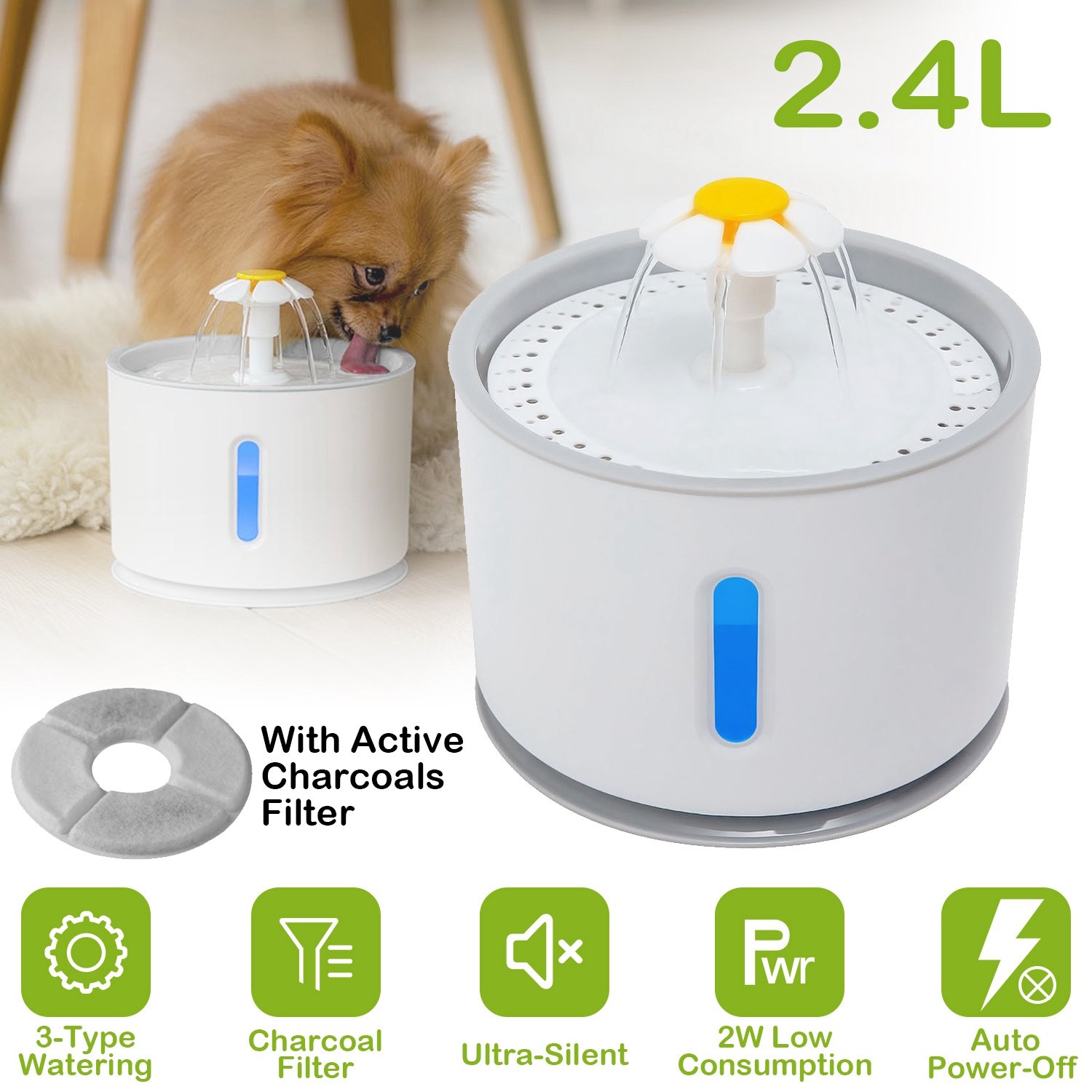 Are you looking for a strong but hygienic fountain to solve the drinking problem of your pet cat or dog? Our automatic daisy flower-shaped fountain may meet your needs. It comes with 2.4L large water capacity to effectively decrease the frequency to replenish water and ease your time and can provide 3 watering types (waterfall style, gush style and waterfall-gush style) to attract and pleasure your pet to drink. Built-in a LED light and a visible window, it can allow you to see the water level conveniently and designing an auto power off function in water shortage state to ensure your pet and the fountain safe. Additionally, it owns a cocoanut shell active charcoal filter to ensure the purity of the water by effectively removing the hair of you cat, bad odor, adverse chlorine and heavy metal contained in the water.