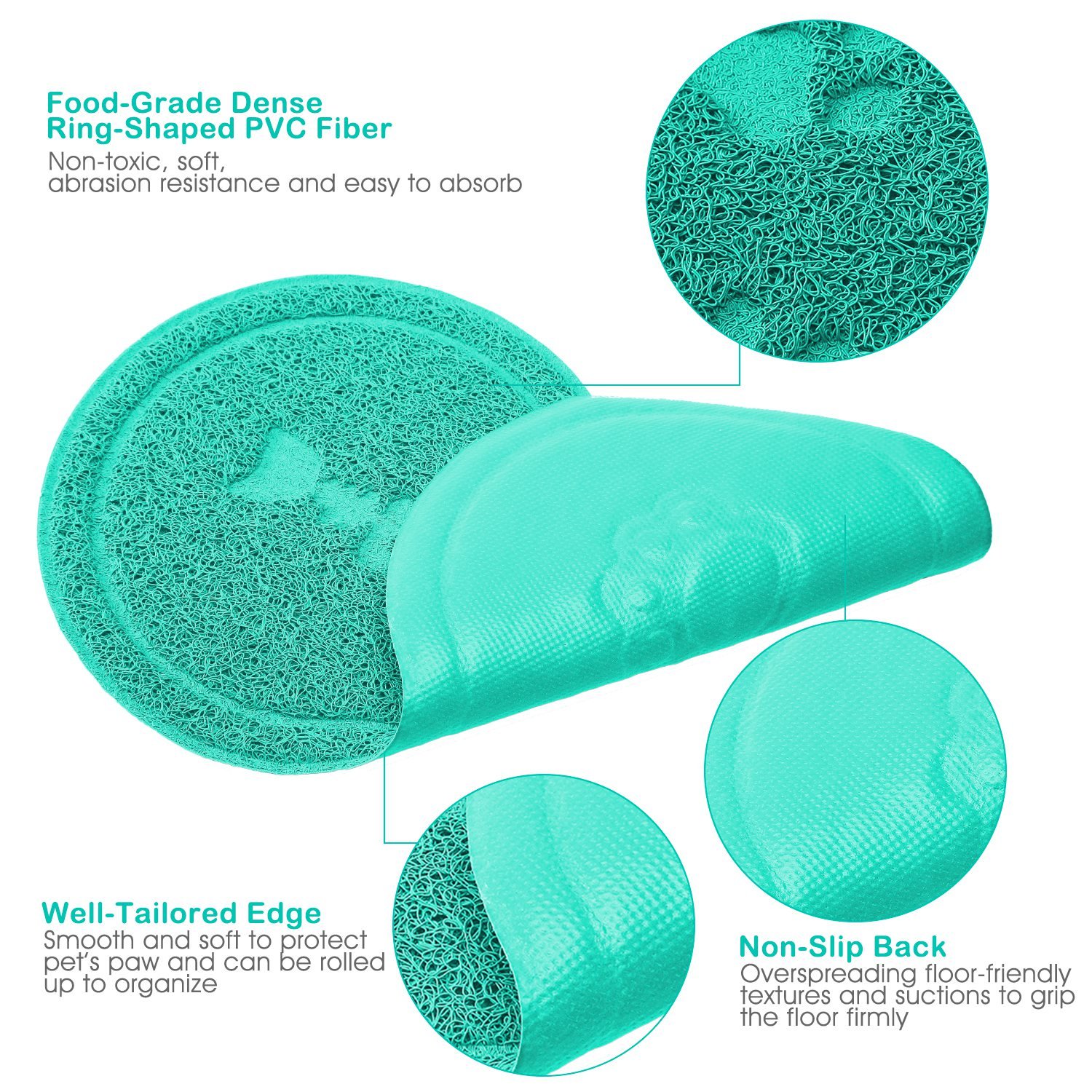 Our pet feeding mat adopts food-grade dense ring-shaped PVC fiber materials, non-toxic, soft, sturdy, durable, abrasion resistance and meantime, can grip the litters tightly to avoid any mess. Overspreading floor-friendly textures and suctions on its back, it is non-slip. It has multiple functions to be used as placemat, litter catcher mat, indoor or outdoor welcome mat, etc.